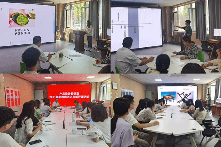 本次活动由胡建华教授主持,教研室副主任贺莹、青年教师导师李亚儒、魏鑫等参加。活动要求青年教师分别从产品设计课程大纲中任选一门课程进行试讲,时间控制在15-20分钟内。其中窦倩倩、周孟君、王明伟、曾敏等11位青年教师分别做了《新艺术运动的发展》《产品设计方法与流程》《人机工程学》《智康产品设计与工程》《仿生产品设计》《专业导论》等课程章节试讲。教研室主任胡建华、副主任贺莹、各位导师分别对新教师进行逐一点评与交流,并提出中肯、客观的评价和建议。