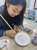 在掌握了基础技艺后,学生们迅速投入红绿彩纹样创新设计的实践中。他们深入“德州宋金红绿彩文化博物馆”和“红绿彩非遗工坊”学习探究德州窑红绿彩的历史背景与文化内涵,从中汲取灵感,同时结合现代审美趋势,尝试将抽象图案、极简线条甚至是数字艺术元素融入传统纹样之中。实习过程中,有学生巧妙地将德州运河文化元素以红绿彩技法呈现设计作品,展现出浓郁的地域特色;有学生则通过对比鲜明的红、绿、黄等色彩搭配,探索红绿彩在现代装饰中的创新应用,让传统工艺焕发新生。