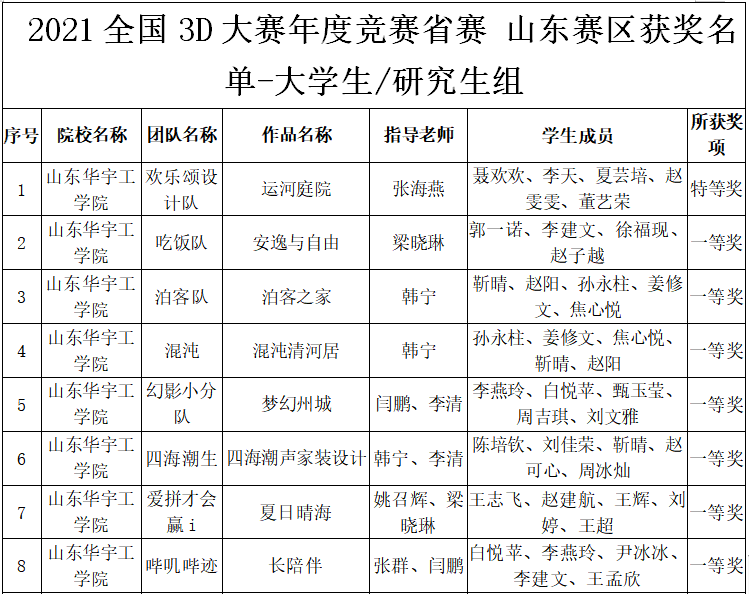 2021全国3D大赛年度竞赛省赛 山东赛区获奖名单的公示