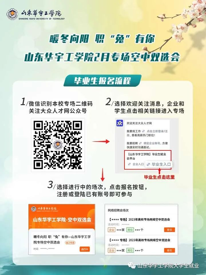微信报名入口:手机微信扫码关注“大众人才网”微信公众号,企业和毕业生分别点击相关按钮进入山东华宇工学院校招端口,点击报名按钮,注册或登录已有账号即可直接参与。