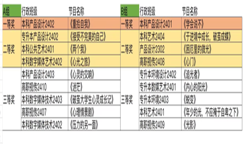 本次活动吸引了众多beat365在线唯一官网院学生的积极参与,共收到来自不同年级、不同专业的多部原创心理情景剧作品。评委老师,对剧本的创作和表演提供专业的点评和建议,最终有18部作品脱颖而出,三等奖10部、二等奖6部、本科产品设计2402《重拾自我》和本科产品设计2401的作品《学会说不》荣获本届心理情景剧活动一等奖。